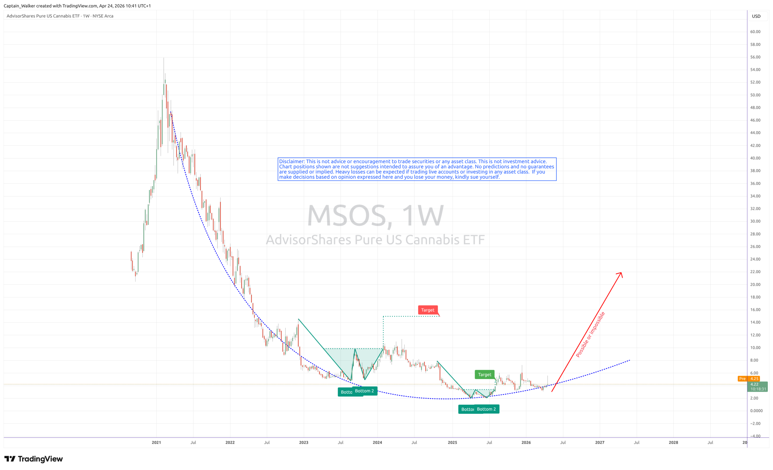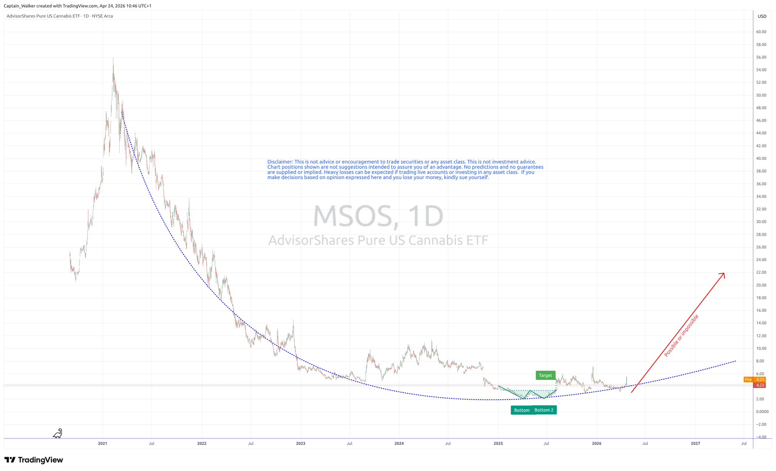 - 3.1 The MSOS “W-Pattern”: Looking at the AdvisorShares Pure US Cannabis ETF (MSOS), a clear double-bottom (W-pattern) formed between late 2025 and early 2026. This technical formation suggests a definitive floor has been established near the $2.00–$2.50 range after a multi-year bear market. The recent vertical breakout from this base indicates a transition from a phase of accumulation to an active uptrend.